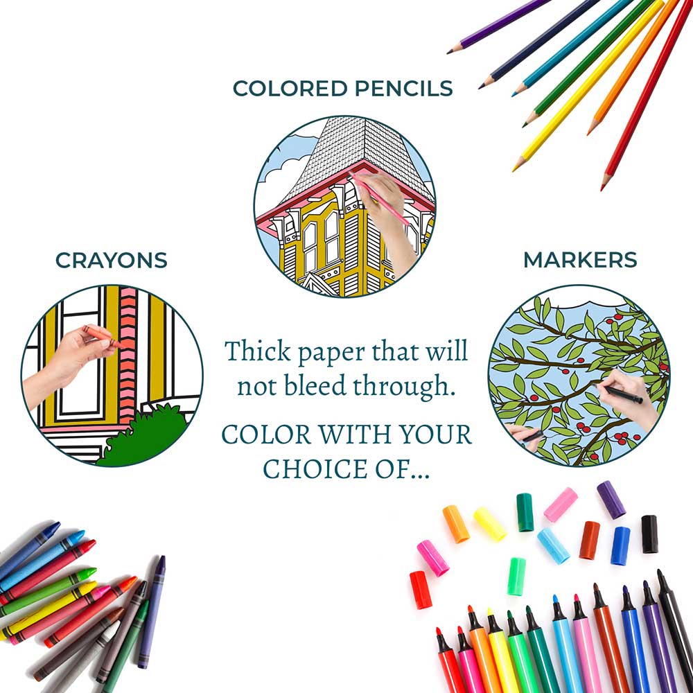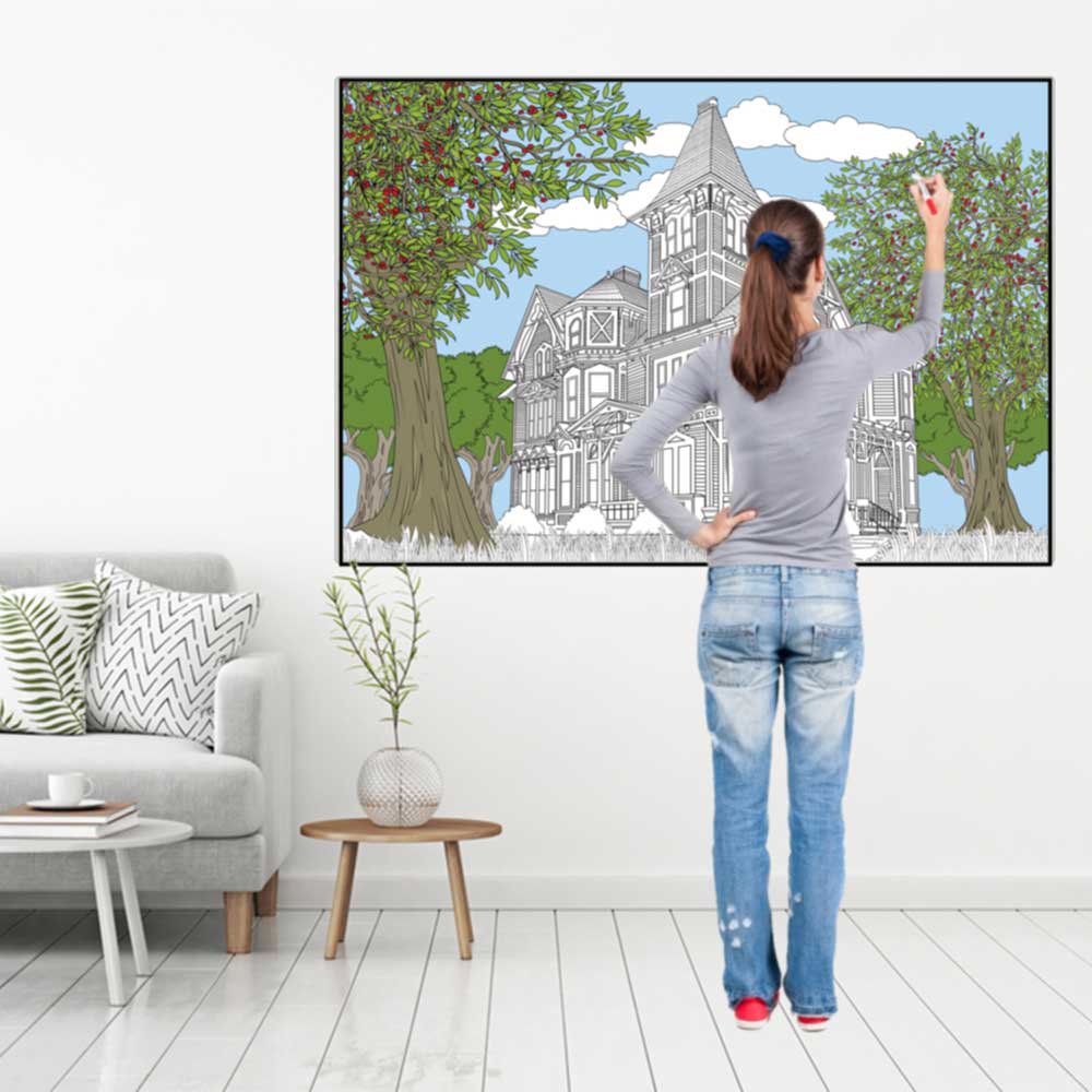 This finely illustrated and detailed poster of a Victorian house is huge (35×52″) and printed on thick 120 lb (180 gsm) premium drawing paper so you can safely use markers, colored pencils and crayons without concern of bleed through.